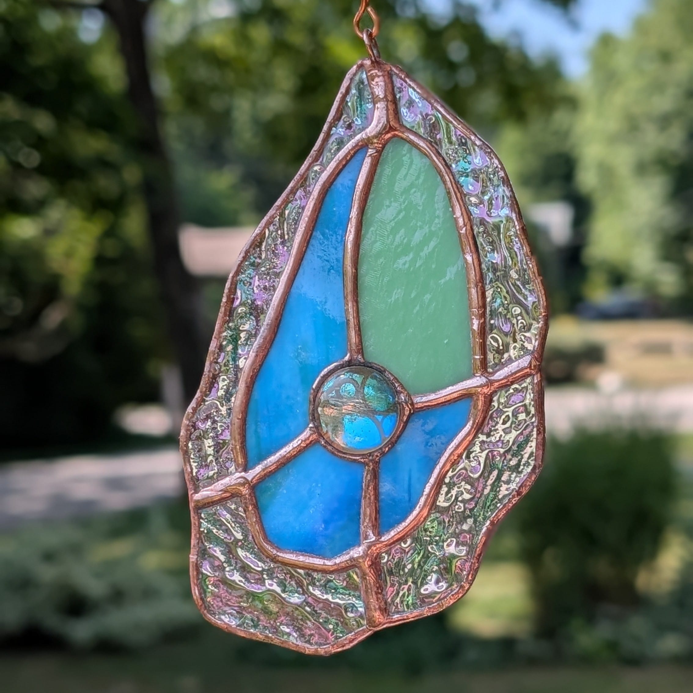 Features luminous iridescent glass that shimmers with a rainbow of colors in the sunlight, paired with a shimmering trichroic glass cabochon “pearl” at its center. Measures 5″ x 3″. Includes 12″ copper chain for hanging.   Free U.S. shipping included in every order.
