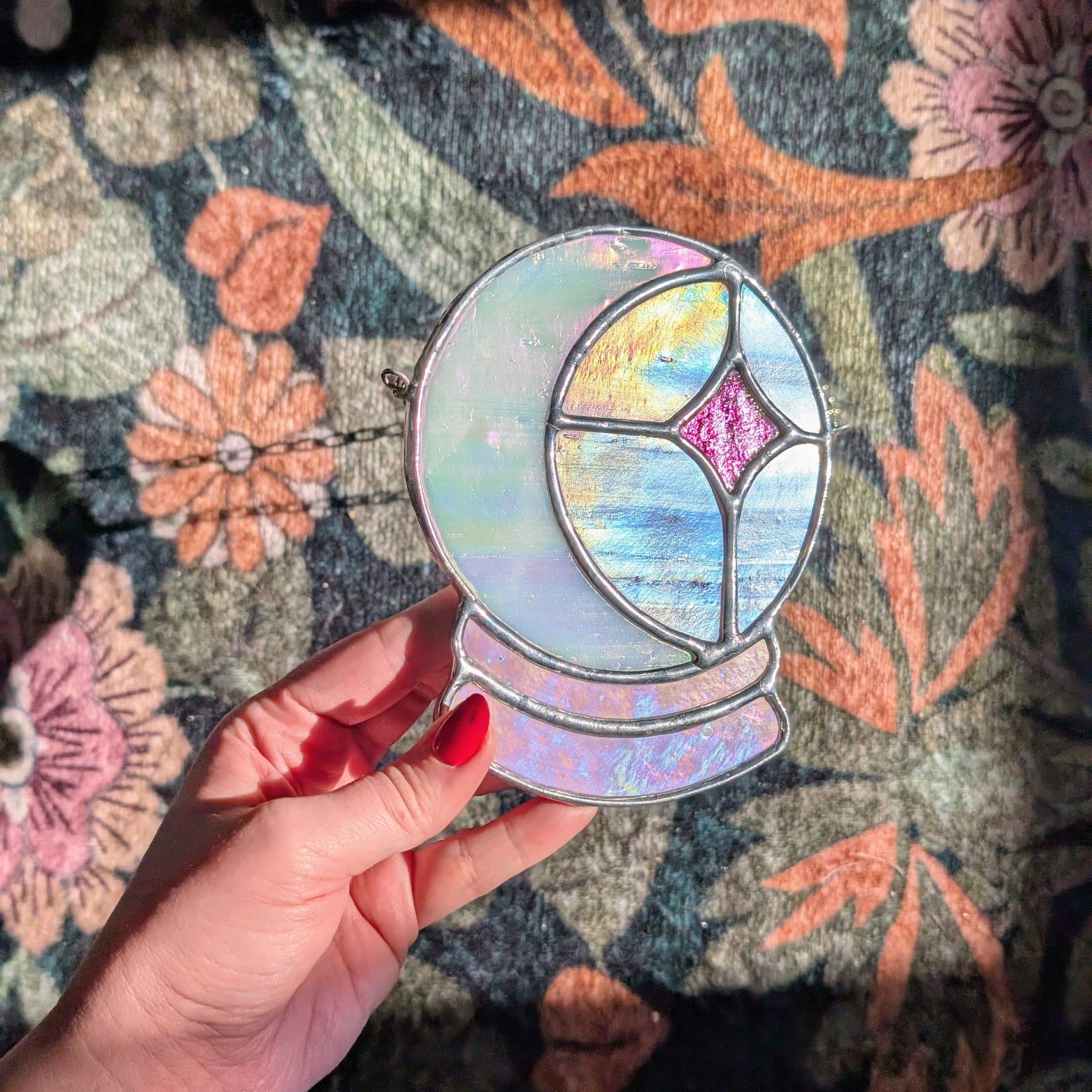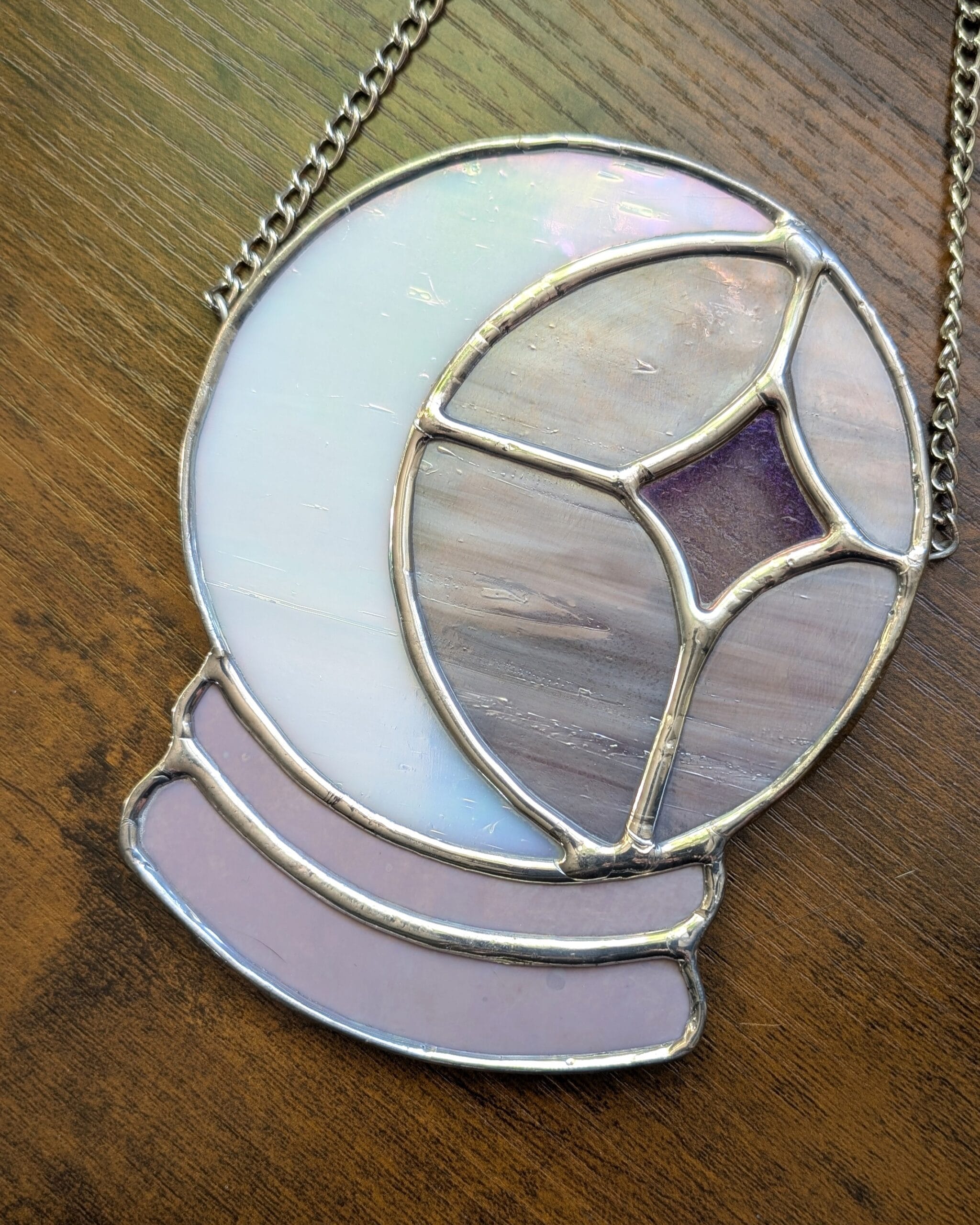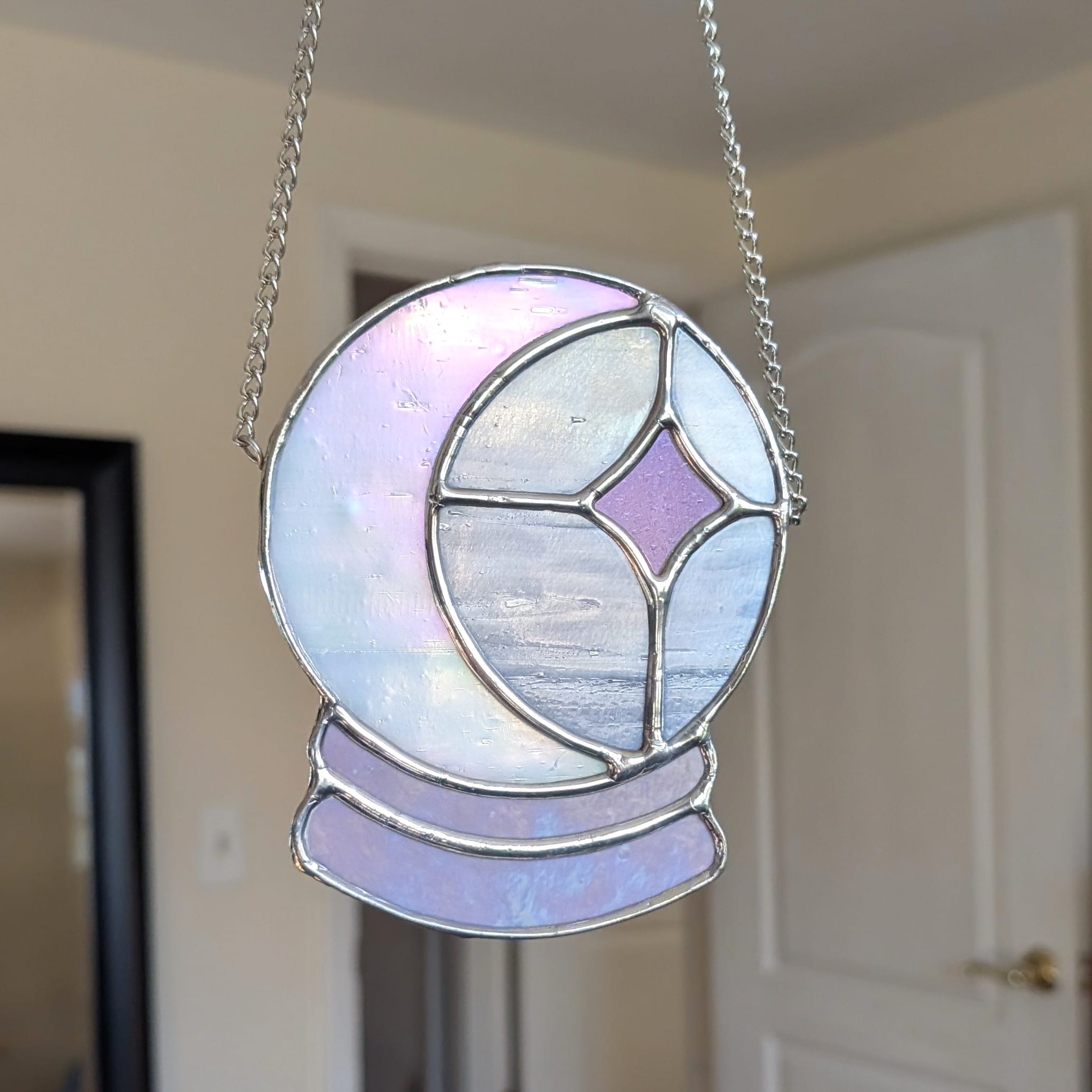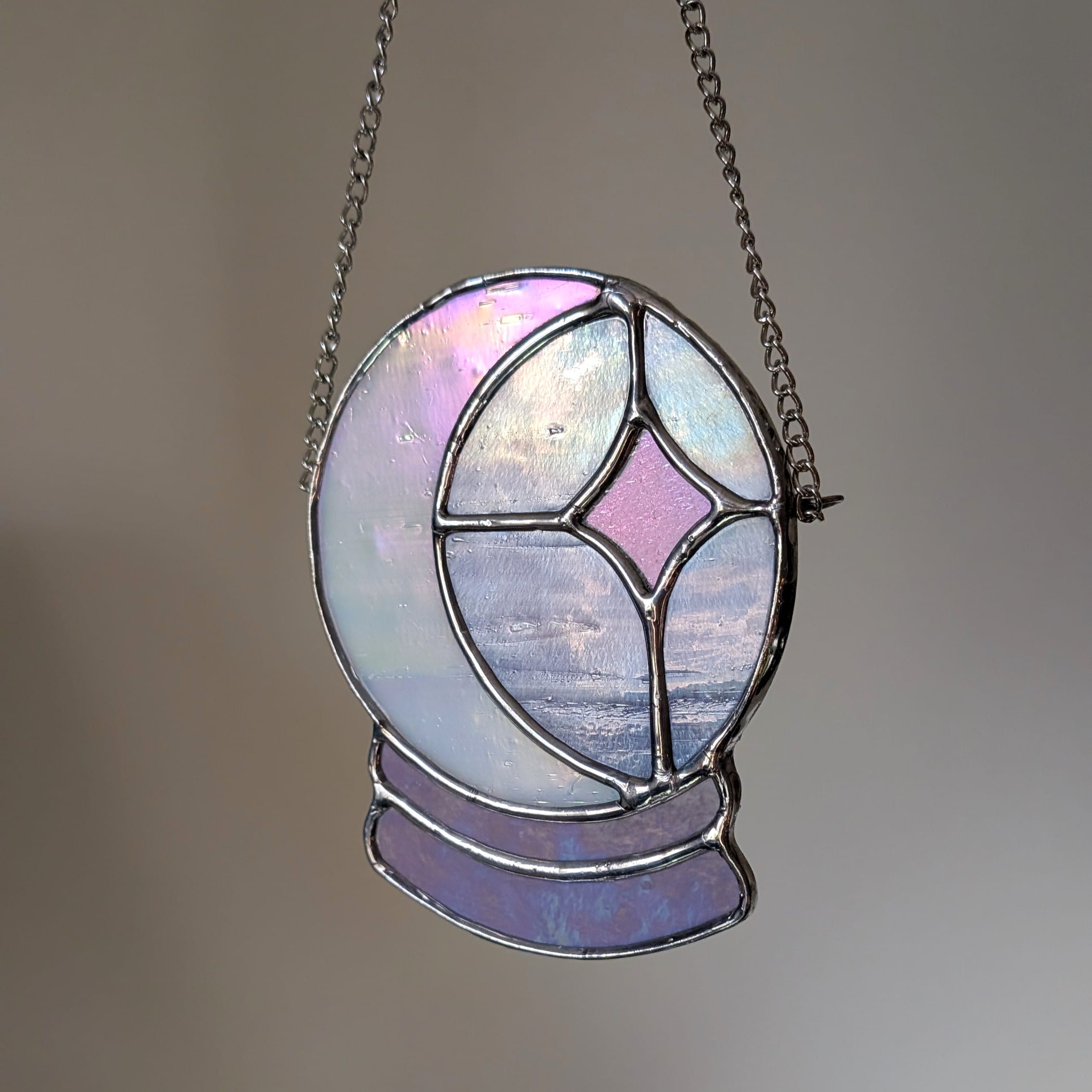 Iridescent crystal ball moon, made by hand scoring glass and soldering together to create a touch of magic for each room. Pattern by Clementine Glassworks.