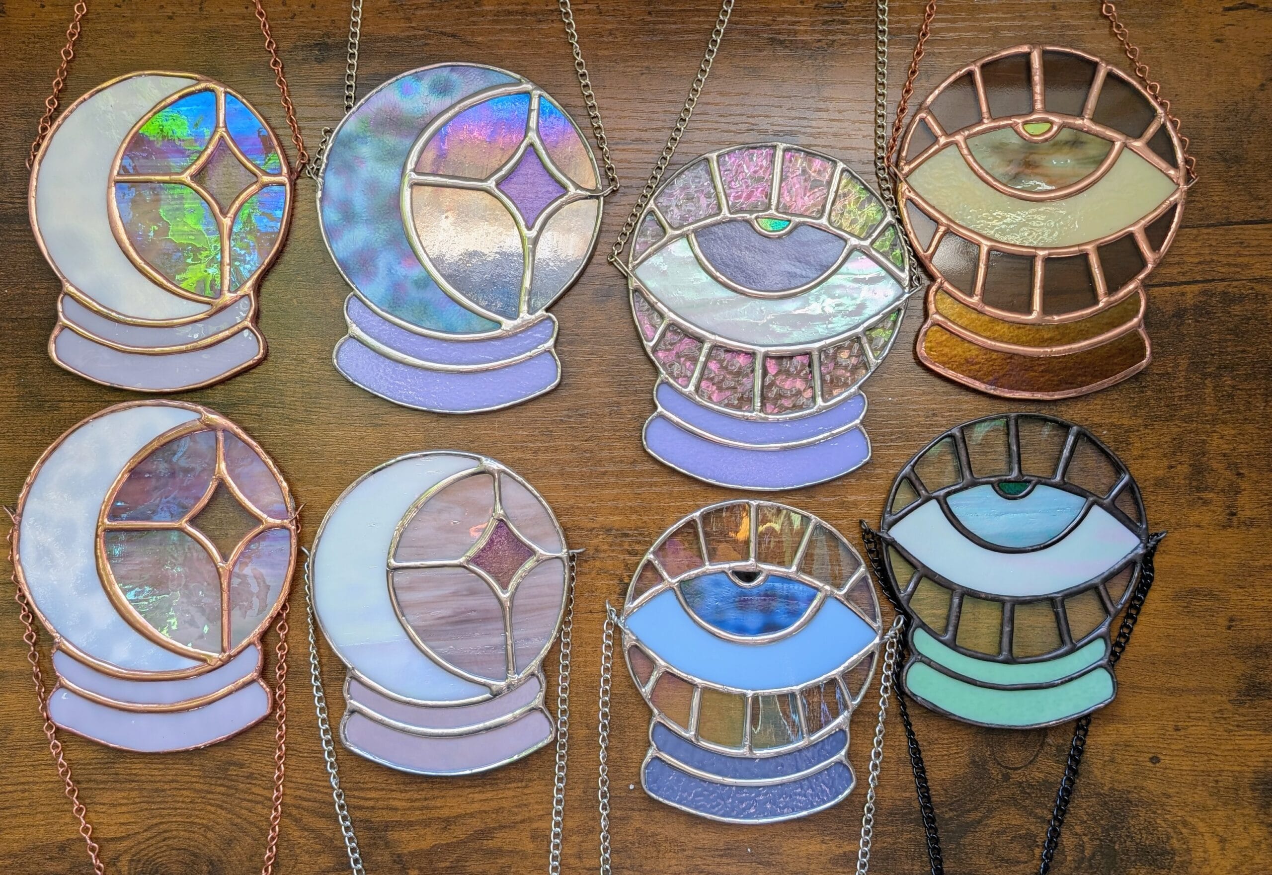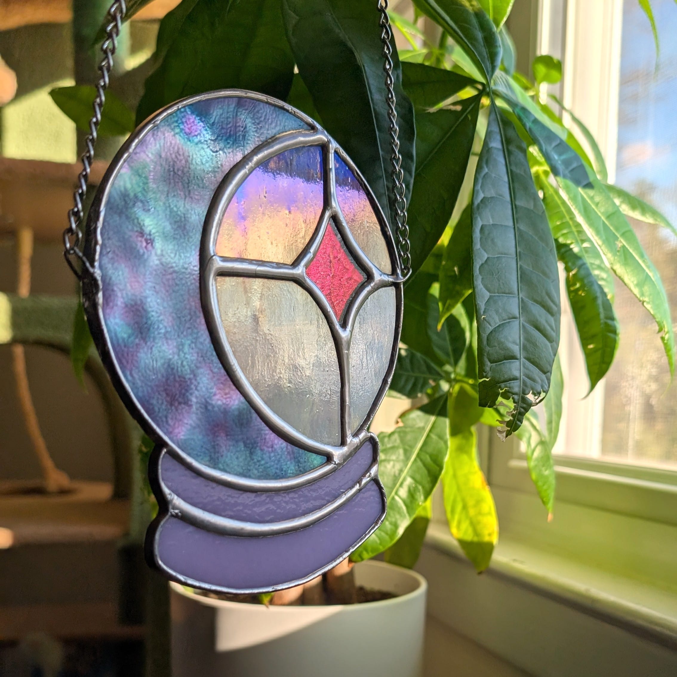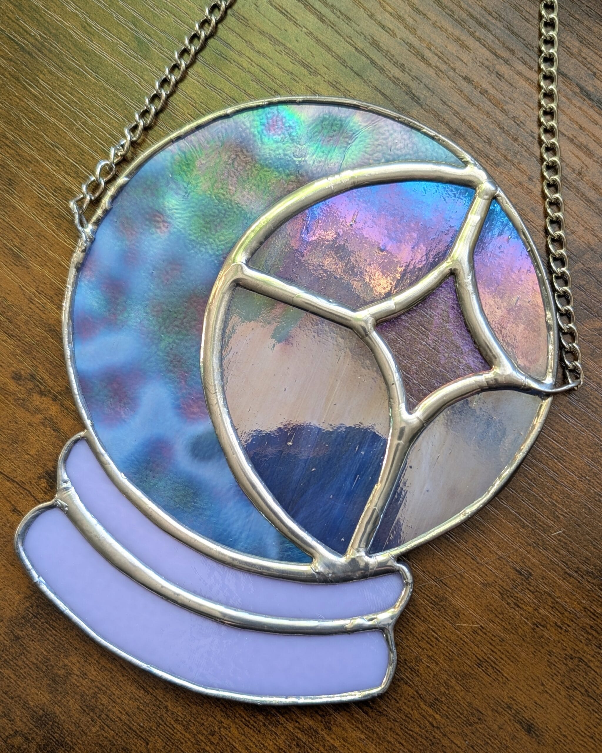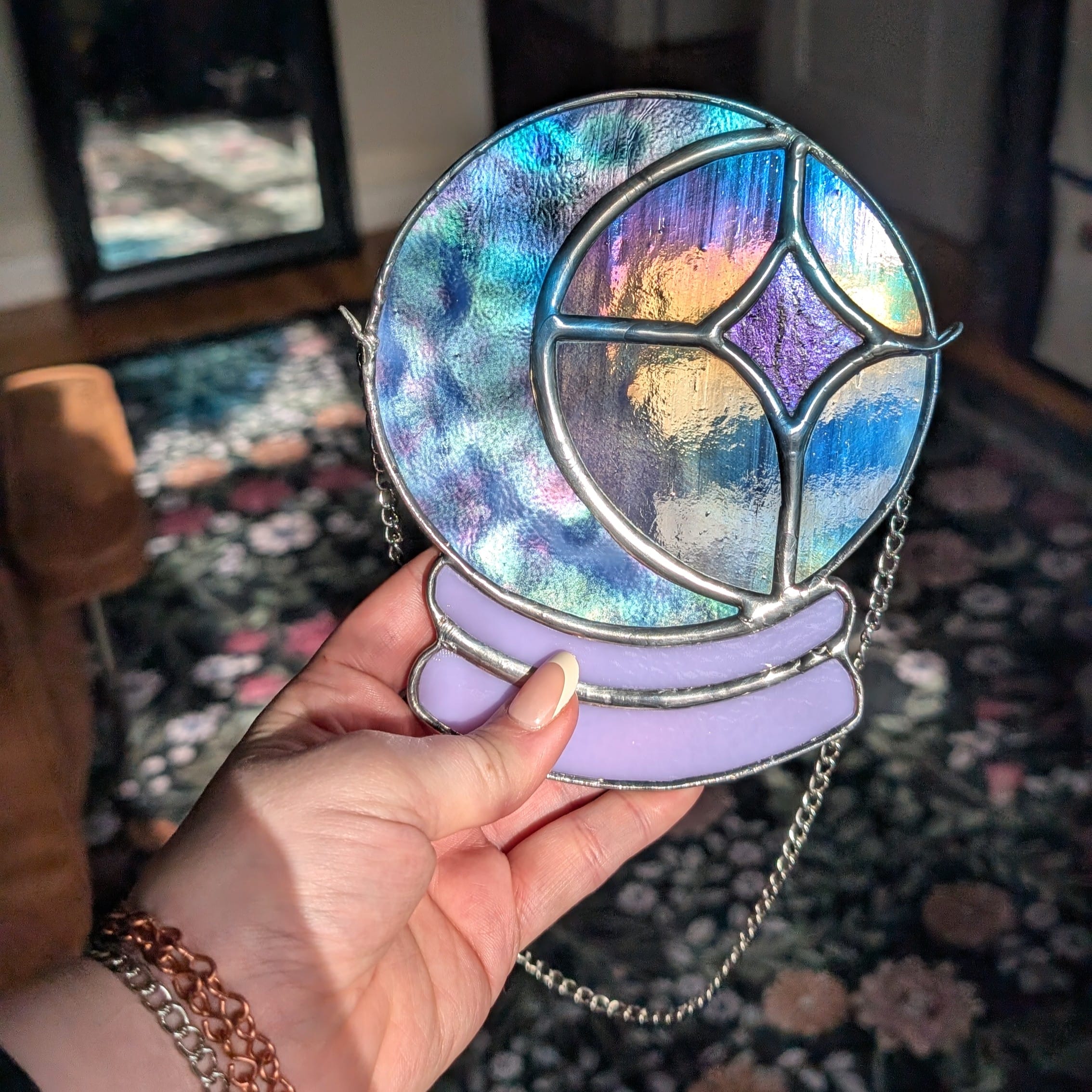 Iridescent crystal ball moon made by hand scoring glass and soldering together to create a touch of magic for each room. Pattern by Clementine Glassworks.