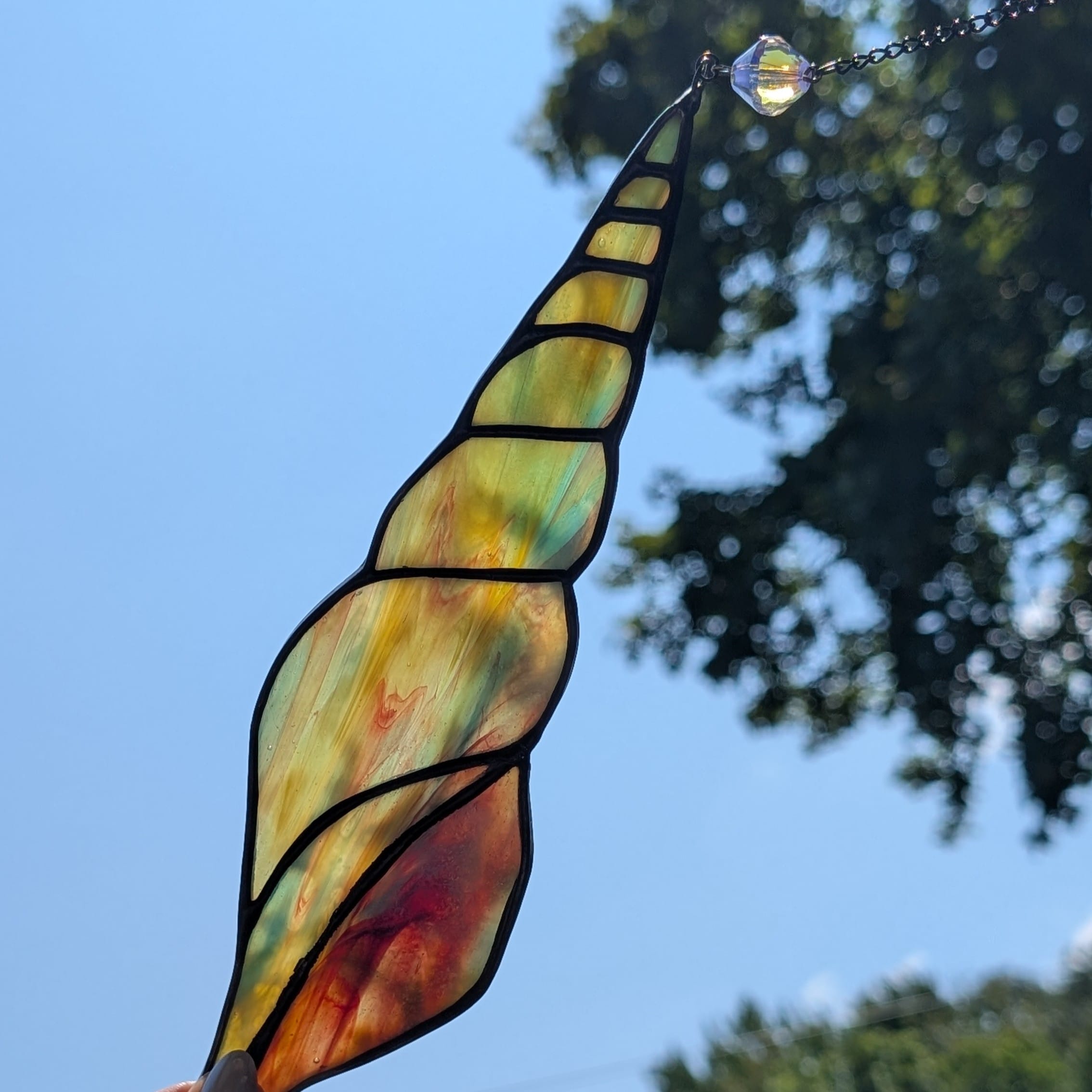 Made from richly swirled glass in warm amber, golden yellow, ocean teal, and coral red, each section captures the shifting colors of a beach sunset. Measures 9″ x 2.5″. Includes 10″ chain with hook for hanging.   Free U.S. shipping included in every order.