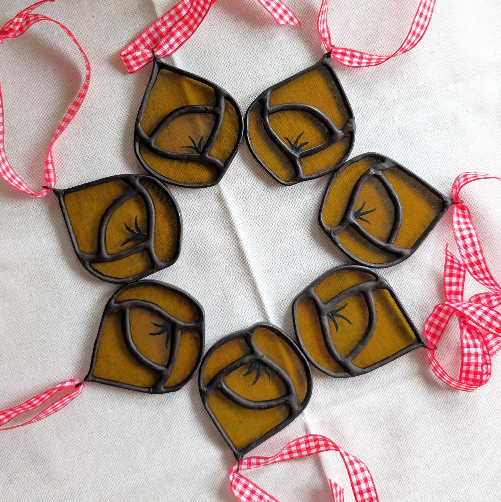 – Iridescent glass – Hand painted details – Red gingham ribbon for hanging 4″ long – Measure 2.5″ x 2″ *Includes shipping costs to the continental US